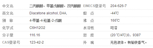 二丙酮醇是由丙酮制造亚异丙基丙酮;甲基异丁基酮;甲基异丁基甲醇及己二醇;佛尔酮;异佛尔酮过程中的中间体二丙酮醇可用以制取金属清洁剂;木材防腐剂; 照相软片和药物的防腐剂;抗冻剂;液压油溶剂;萃取剂和纤维整理剂等。二丙酮醇广泛用作静电喷漆;赛璐珞;硝化纤维;脂肪;油脂;蜡和树脂等的溶剂。