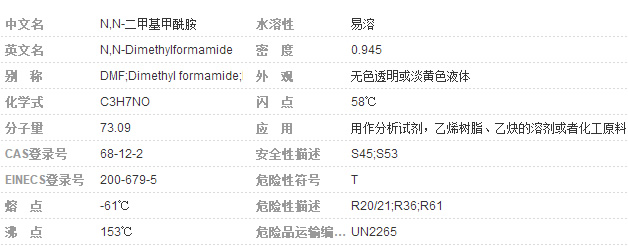 DMF是无色、淡的氨气味的液体。分子式C3-H7-N-O。分子量73.10。相对密度0.9445(25℃)。熔点-61℃。沸点152.8℃。闪点57.78℃。蒸气密度2.51。蒸气压0.49kpa(3.7mmHg25℃)。自燃点445℃。折射率1.42817,溶解度参数δ=12.1。蒸气与空气混合物爆炸极限2.2~15.2 %。与水和通常有机溶剂混溶,与石油醚混合分层。遇明火、高热可引起燃烧爆炸。能与浓硫酸、发烟硝酸剧烈反应甚至发生爆炸。危险标记 7(易燃液体) 主要用途 主要用作工业溶剂,医药工业上用于生产维生素、激素,也用于制造杀虫脒。